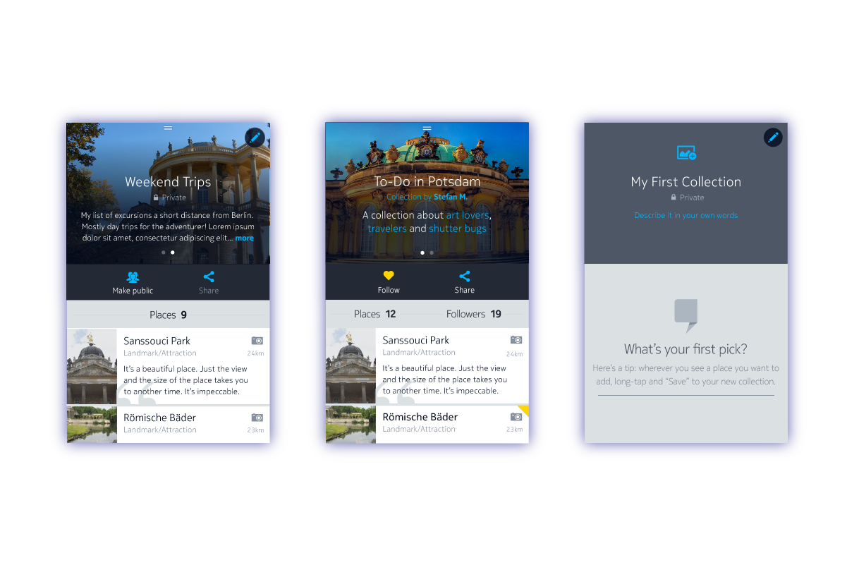 Initially launched only in the Windows Phone platform the app received a full redesign aiming the Android platform with key enhancements such as public shareable lists of places, profiles of key influencers and novel ways of finding the right place for the occasion.